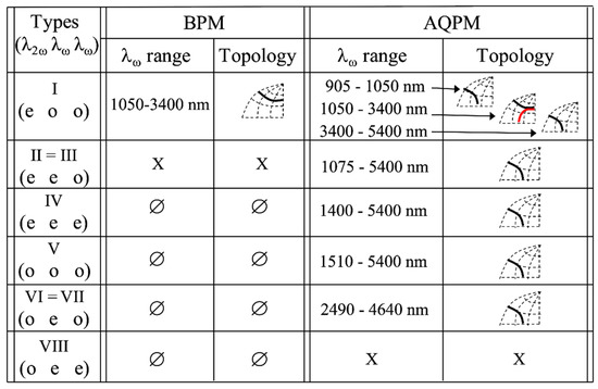 Figure 9 provide the description of accessible types of SHG interactions in a 7%MgO:PPLN with a grating period = 15 µm, showing the associated spectral ranges of solutions for BPM and for AQPM (left and right parts of Figure 9, respectively). Figure 9 clearly illustrate the enlargement of the spectral range that can undergo SHG while considering AQPM with respect to BPM, both for smaller and larger fundamental wavelengths, respectively, from 905 to 1050 nm and from 3400 to 5400 nm, compared to the 1050–3400 nm spectral range of BPM. Note that the SHG spectral range of scheme-B AQPM is the same as that of BPM but shows different directions of solutions and thus exhibits different effective coefficients. More specifically, the topology of the scheme-B type I SHG cone for a nonlinear period = 15 µm corresponds to the topology, while the topology is observed for a nonlinear period = 32.2 µm for the same scheme-B type I SHG cone, as seen in Figure 7a.