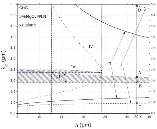 As already discussed in Figure 8 and Figure 9, the grating period has a major influence on both the spectral ranges and the directions of AQPM solutions for each type. Figure 10 highlight this influence: it depicts the fundamental wavelength tuning ranges and maximal acceptance domains of types I, II = III, and IV scheme-A AQPM SHG calculated in the xz-plane as a function of the grating periodicity .