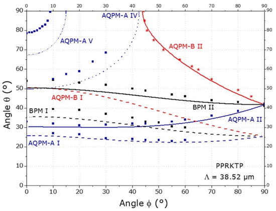 SHG at a fundamental wavelength λω = 2.15 μm in a spherical PPRKTP crystal with a grating period Λ = 38.52 μm: calculated Types I and II BPM angles (black lines), calculated Types I, II, IV and V AQPM-A angles (blue lines), Types I and II AQPM-B angles (red lines) and red stars for the measurements described in [21]). Black and blue squares are experimental data obtained in [20]. θ and are the angles of spherical coordinate in the dielectric frame (x, y, z).