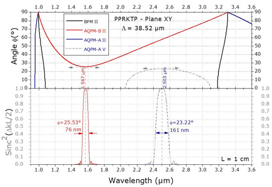 To go further with the demonstration of AQPM potentialities in biaxial crystals, numerical investigations have been conducted in PPRKTP with a grating period of 38.52 µm for an SHG interaction in the xy-plane, using the Sellmeier equations given in [20]. As shown in Figure 12(top), the angular range as a function of the fundamental wavelength is reported for Type II solutions, both for BPM, scheme-A and scheme-B AQPM, as well as for Type V scheme-A AQPM solutions [21].