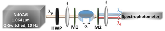 In both cases, the configuration of polarization enabling the excitation of the largest nonlinear coefficient has been chosen, i.e., corresponding to in the contracted notation: they refer to type V in the case of PPKTP according to Table 2, Table 3 and Table 4 and type IV for 5%MgO:PPLN according to Table 1. A cylindrical shape had been chosen for the two crystals, with a diameter of 10 mm for PPKTP and 38 mm for 5%MgO:PPLN, since only one dielectric plane allows us to access the full angular tunability, i.e., the xy-plane. Figure 13 depict the scheme of the corresponding experimental setup.