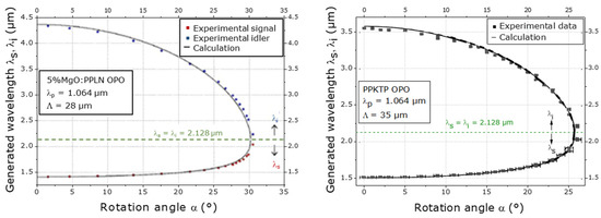 In both cases, it was a Singly Resonant OPO (SROPO) on the signal wavelength λs. The pump laser is a Q-switched Nd:YAG laser at λp = 1.064 μm with a repetition rate of 10 Hz and a pulse duration of 5.1 ns at 1/e2 for PPKTP and 10 ns (FWHM) for 5%MgO:PPLN. The pump beam is properly focused in order to obtain parallel beam propagation inside the cylinder. The corresponding tuning curves are shown in Figure 14.