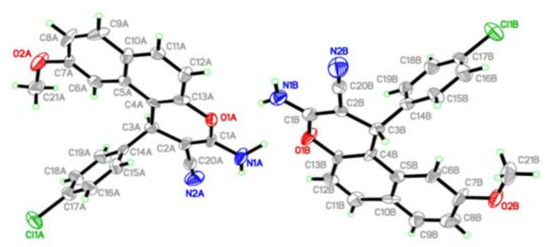 The crystalline configurations of drug candidates have amassed substantial appreciation as a critical criterion for rational drug design with the manipulation of their functional moieties impacting the drug’s structure–activity relationship. Generally, the attained crystallographic data offer explicit/precise structural identification and absolute configuration [1,2,3,4,5,6], which accordingly elucidates the performance of the novel drugs without triggering the adverse response of the biological system stimuli. Of the drug candidates with an elevated disposition to forge crystallographic structures, chromene compounds are among the most notorious and prosperous [7,8,9]. The comprehensive biomedical features of chromene molecules have motivated scientific figures within the drug discovery biosphere to cultivate new derivatives of this class of materials and explore their novel biological characteristics. Chromenes have been renowned for their incredible biological functions, which assisted their assimilation into various applications such as antimicrobial activities [10,11,12,13,14], hypolipidemic [15], antileishmanial, antiviral, anti-HIV, antianaphylactic activities [16,17,18], insecticidal [19], targeting of c-Src kinase enzyme [20,21], anticancer and cytotoxic activities [22,23,24,25], cell cycle analysis, apoptotic effects, caspase 3/7, and inhibition of the topoisomerase enzyme [26,27,28,29,30,31,32,33]. Among the synthetic strategies to acquire chromene molecules, microwave irradiation is one of the most efficacious and eco-friendly procedures, which facilitates the isolation of the desired compounds in a short period of time and results in good yields [34,35,36,37]. Furthermore, the dihydrofolate reductase (DHFR) enzyme used as a therapeutic target in the treatment of infections through NADPH is used in the reduction of DHFR and is involved in the synthesis of cell proliferation raw material [38]. DHFR inhibitors are widely used in the treatment of fungal, bacterial, and mycobacterial infections through block DNA replication as well as in fighting cancer [39]. In addition, the chromene derivatives are used as potential agents against DHFR [40].