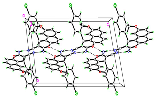 In the title compound 4, C21H15ClN2O2, the crystallographic data and purification information are outlined in Table 1. The asymmetric unit of molecule 4 incorporates two independent compounds, which is witnessed in Figure 1. All the bond lengths and angles are in normal ranges [58]. As displayed in the crystal packing (Figure 2), the molecular components of compound 4 were linked through two intermolecular hydrogen bonds and two intramolecular hydrogen bonds, as shown in Table 2.