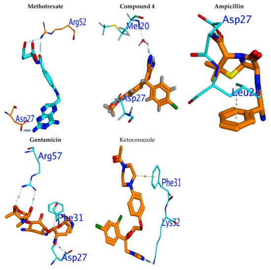 According to the inhibitory functionalities of molecule 4, the molecular docking was performed against dihydrofolate reductase “DHFR”, and its positioning of the active compound within the substrate binding pocket assists in the comprehension of its mode of interaction. We selected two crystal structures for the hDHFR protein ((PDB): 4DFR [61]) and (PDB ID: 3NTZ [62]). Compound 4, the reference inhibitor Methotrexate, and reference drugs (Ampciline, Gentamicin, Ketocwere) were stationed in the binding pocket of enzyme s, and its binding interactions were illustrated in Figure 3 and Figure 4.