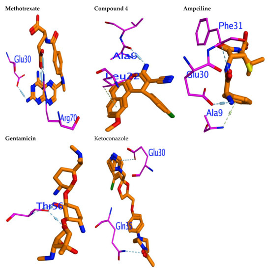 In case of 3NTZ; Compound 4 showed the highest BI = −9.43 Kcal/mol. compared to other inhibitors (Table 5). BI was arranged for other inhibitors as Gentamicin > Ketoconazole > Ampciline > Methotrexate. The active site of 3NTZ comprises the following amino acid residues: Val 6, Ala 9, Leu 22, Pro 25, Asp 27, Leu 28, Glu30, Gln35, Phe 31, Ser 49, Ile 50, Thr56, Leu62, and Thr 111. Compound 4 formed a strong H-bond between the amino group and Ala9 and formed a π-π bond between Leu22. Methotrexate showed an H-bond with Glu30 and Arg70 (Figure 4). Therefore, the interaction with vital amino acids of hDHFR plays an important role in the inhibitory effects of this compound. Furthermore, the activities of compound 4 were due to the presence of the amino and cyano groups.