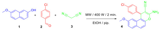 - El-Agrody, A.M.; Al-Dies, A.-A.M.; Fouda, A.M. Microwave assisted synthesis of 2-amino-6-methoxy-4H-benzo [h] chromene derivatives. Eur. J. Chem. 2014, 5, 133–137. [Google Scholar]