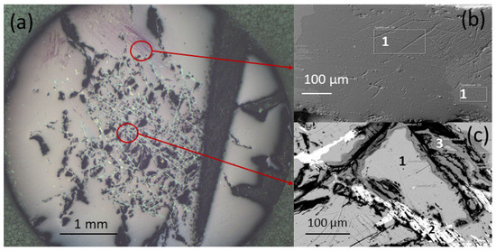 (a) Polarized microscopy image of a cross-section of La1.51Sr0.19Eu0.3CuO4 grown using Eu-free, Cu-poor solvent. (b,c) SEM backscattered electron images corresponding to the areas marked on the left panel, where: 1—La1.51Eu0.3Sr0.19CuO4; 2—areas enriched with Sr; 3—areas enriched with Eu.