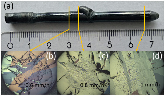 (a) Photo of the crystal with general composition La1.51Sr0.19Eu0.3CuO4, grown with different growth rates; (b–d) polarized microscopy photography of single crystal cross-sections, respective to a different growth rates, applied during the growth run.