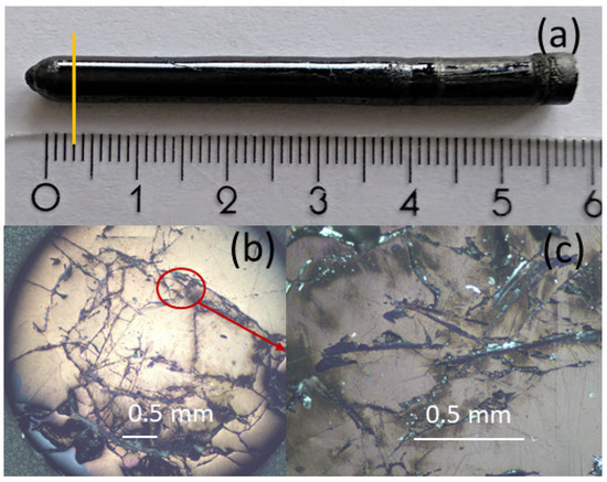 Using the determined optimal growth parameters, (i) oxygen pressure 9–9.5 bar and (ii) a “CuO-poor” Eu-free solvent with a molar ratio of La2O3:SrCO3:CuO = 4:4.5:16.5, single crystals for Eu-substituted LSCO were obtained for different values of x = 0.2 ÷ 0.4. As shown in Figure 6, the obtained crystals (length up to 70 mm and 5–5.5 mm in diameter) exhibited a metal luster on the surface, while the single-crystal part of the ingots was up to 30 mm in length and up to 4.5 mm in diameter. The polarized microscopy of cross-sections of the end portions of the grown ingots for x = 0.2 and 0.3 showed a large main singe-crystal grain with some secondary grains close to the ingot border. The analysis with EDX confirmed the composition of the crystals to be La1.61Sr0.19Eu0.2CuO4 and La1.51Sr0.19Eu0.3CuO4, respectively.
