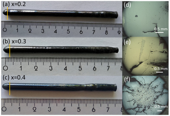 Grown crystals of nominal composition La1.81−xSr0.19EuxCuO4, x = 0.2 (a), x = 0.3 (b) and x = 0.4 (c) and their corresponding cross-sections (d–f).