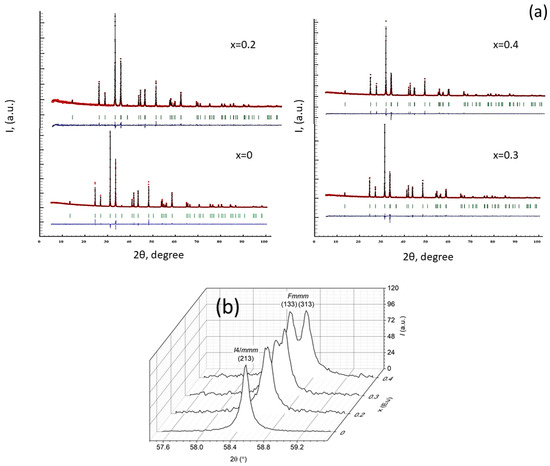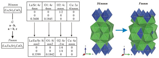 Peak splitting is indicative of a symmetry reduction. All reflections of the Eu-substituted LSCO with nominal x = 0.4 were successfully indexed in the orthorhombic system and appeared to be similar to several structural modifications of the LSCO compound with orthorhombic space groups Cmce [13] and Fmmm [14]. The Rietveld refinement for all the Eu-substituted LSCO compounds was performed for both space groups, and showed that the space group Fmmm was slightly favorable compared to Cmce, resulting in lower RBragg and especially RF residuals, and significantly reduced standard deviations in atomic coordinates of the O1 atoms. In our XRD experiment, we did not detect additional reflections that corresponded to the C-centering of the crystal lattice, due to their very low intensity. Moreover, a direct transition from the I4/mmm space group to Cmce was impossible and required an intermediate transfer through the space group Fmmm. This transition from I4/mmm to Fmmm was performed with the transformation of the a and b lattice vectors, resulting in the doubled volume of the unit cell (for more details, see Figure 8).