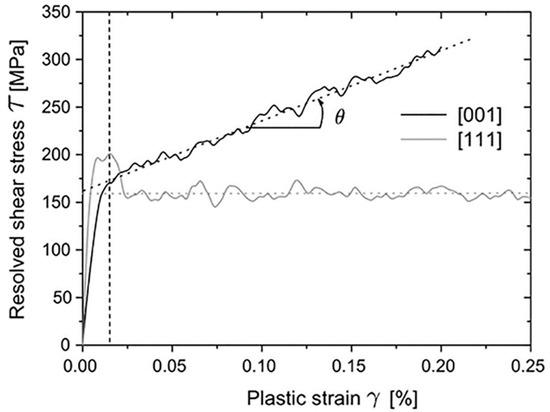 The stress–strain curve of a single crystal that was deformed by tension can be divided into three distinct stages: the easy glide stage, linear strain hardening stage and parabolic hardening stage [34]. The work hardening behavior of a single crystal strongly depends on the initial tensile orientation of the single crystal as not all of the orientations of single crystals show the three-stage hardening behavior. It is important to refer to the crystallographic rotation under tension, as elucidated by Schmid [35,36]. There are two origins for the hardening of crystals during deformation: the physical hardening caused by the increase in dislocation density and the geometric hardening caused by crystal rotation. As illustrated in Figure 1, single crystal nickel with a [001] orientation exhibited a strong linear hardening, while single crystal nickel with a [111] orientation exhibited a stress drop after an upper yield joint [37]. Only two distinct stages could be observed because multiple slip systems were activated at the start of the deformation, despite the two loading cases responding entirely differently. The low work hardening rate of the [111]-orientated sample was caused by the cross-slip of dislocations to release the dislocation tangles and the accumulation of dislocations to increase the density was diminished.