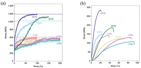 (a) The stress–strain curves of single crystal aluminum with initial orientations of [001], [111], [112], [101], [102] and [213], as obtained by the MD simulations [23]; (b) the corresponding experimental stress–strain curves, as obtained from tensile straining tests using single crystal copper [14].