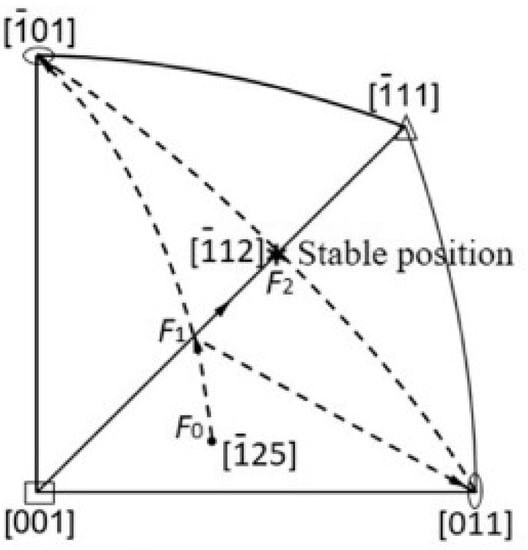 Saai et al. [43] performed tensile experiments using single crystal aluminum with a special initial orientation of [25] to investigate crystal rotation during uniaxial tensile deformation. The deformation path is described by the stereographic projection map in Figure 3. At work hardening stage I, dislocations began to glide on the slip system of (111)[01]. As the deformation proceeded to work hardening stage II, the slip direction [01] of the crystal rotated toward the tensile axis and continued to rotate toward the [001]–[11] symmetry boundary of the stereographic triangle. At this symmetry boundary, the primary slip system of (111)[01] and the conjugate slip system of (1)[001] were equally oriented for slip and became activated. As it deformed further, the tensile axis rotated along the symmetry boundary toward the [12] orientation. However, the axis trajectory slightly overshot the edge and returned to it until the crystal rotated to a stable orientation of [12], which indicated that the shear stress that was required for slipping in the conjugate system was higher than that for slipping in the active system.