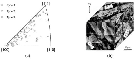 In addition, for FCC metallic single crystals that are sheared along (111)[11], the co-planar slip system is activated. As shown in Figure 9, the work hardening rate of single crystal nickel that was sheared along (111)[11] was higher than a specimen that was sheared along (111)[01], but lower than a specimen that was sheared along (100)[010]. However, few researchers have investigated the dislocation structures of co-planar slip systems that are activated under simple shear. As dislocations that have two slip directions that are activated in the same (111) slip plane interact with each other, the dislocation boundary deviates from {111} by more than 10°.