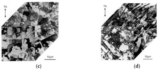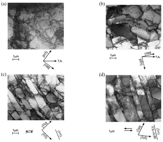 As the crystal rotation mechanism is significantly different under tension and shear, the dislocation structures that are formed during simple shear as are completely different from those that are observed during tension. Lopes et al. [97] investigated the dislocation substructures of an aluminum alloy that was deformed by tension and shear. The dislocation tangles could be observed during the initial stages of tensile deformation without the formation of dislocation cell structures (strain of 6%), while well-defined dislocation cells were formed at strains of about 12%, as shown in Figure 10a,b. However, the dislocation microstructures exhibited straight dislocation walls and the shape of each dislocation cell was identical after simple shear deformation, as shown in Figure 10c,d. A parallelepiped closed cell structure was formed after simple shear deformation because one or two families of the straight dislocation walls were intersecting with each other. The dislocation density inside the cells was different when the aluminum alloy was sheared along different orientations, causing the crystals to exhibit different work hardening rates when deformed along different shear planes and shear directions. Few slip systems were activated during simple shear, which gave rise to the straight dislocation walls and elongated cells.