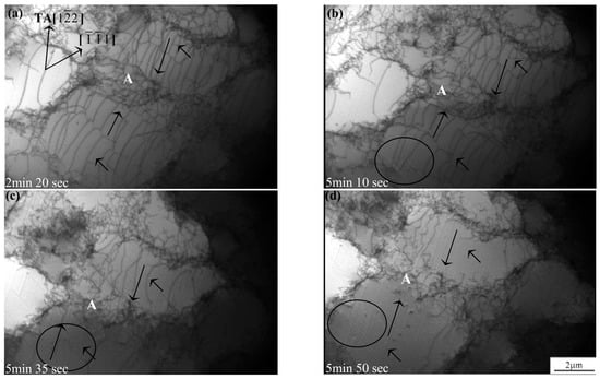 The in situ TEM observations of dislocation boundary evolution and the cross-slip of dislocation when single crystal aluminum was deformed to work hardening stage III [65], (a–d) frames at the time of 2 min 20 s, 5min 10 s, 5 min 35 s and 5 min 50 s, showing the depletion of the cell’s volume from dislocations into the cell’s boundary by cross slip of dislocation, respectively.