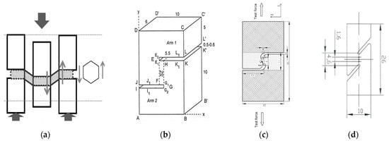 The different ways to directly apply simple shear that have been proposed in the literature: (a) a specimen with a double shear zone [74]; (b) a double-notch specimen in compression mode [70,71] (SZ is the zone of shear); (c) a double-notch tensile–shear specimen [75]; (d) a tilted double-notch tensile–shear specimen [76,77].