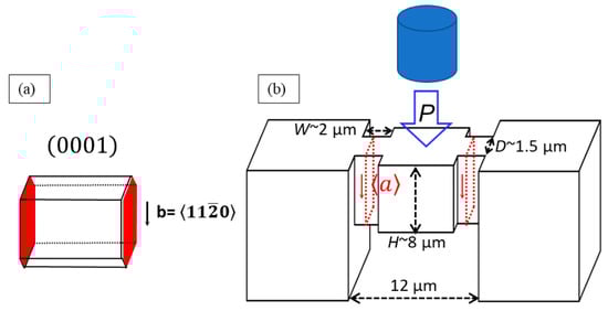 (a) A schematic of the shear plane and the shear direction of single crystal magnesium; (b) the geometry of single crystal magnesium under microshear [90].