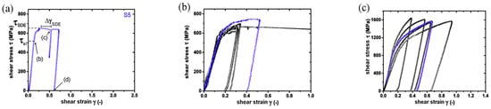 Shear deformation, which is usually referred to simple shear, is a plane strain deformation mode that is characterized by early localization and intensive straining along with shear bands. The schematics of a double shear test are shown in Figure 7a. It can be observed that the specimen had two symmetrically sheared zones and was acted on by an axial load. The symmetry of the specimen facilitated shear loading and the specimen did not suffer from a change in slip geometry during testing.