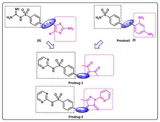 The azo group/sulphonamide hybrid structure was the first well-organized chemotherapeutic agent that could be applied efficiently for the treatment of infections caused by bacteria in humans. Prontosil (I, Figure 1) was recognized as a bioprecursor to the active compound, sulfanilamide, possibly metabolized by azoreductases released either in the liver or by gut microbiota [4,5]. Azoreductases are flavoenzymes that have been distinguished in a range of prokaryotes and eukaryotes [6]. Gaffer et al. [7] explored the synthetic methodology of new amino-thiazolylazo-sulphonamide (II). The synthesized dyes were investigated for their anti-bacterial and anti-fungal activities against Gram-positive and Gram-negative bacteria, as well as a fungi (C. albicans).