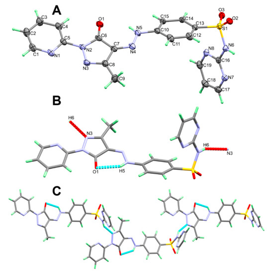 As a continuation to our research on sulfa drugs [9,10,11], our current research focus is on sulfadiazine [12], a model scaffold to discover new sulfadiazine bioprecursors. Herein, novel models have been designed which feature similarities between our target compounds and lead compounds, as clarified in Figure 1. They are synthesized and characterized by microanalytical analyses, 1HNMR and 13CNMR. Particularly, sulfadiazine-pyrazole prodrug 5 is further investigated via X-ray single crystal diffraction which provides the screening, testing, and complete data collection. Furthermore, density functional methods (DFT) will be applied to achieve a valuable understanding of the electronic and molecular properties of the target 5.