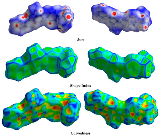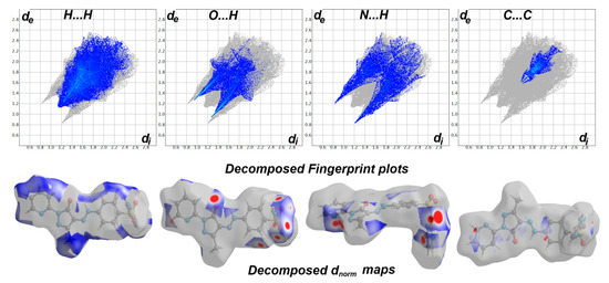 The Hirshfeld calculation is a simple and accurate tool for the finding the different atom–atom contacts in the crystal structure. Hence, decomposition of the different intermolecular contacts in the crystal structure of 5 was performed using Hirshfeld calculations. The resulting Hirshfeld maps are presented in Figure 3. There are different levels of intermolecular contacts as indicated from the presence of red, white, and blue regions in the dnorm map.
