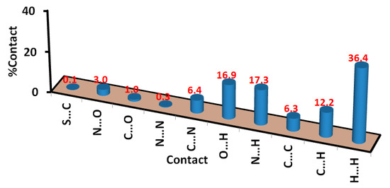 Analysis of these interactions using fingerprint plot is given in Figure 4. The fingerprint area gave the percentages of all intermolecular interactions in the crystal structure of 5. Presentation for these interactions and the percentages for all contacts in 5 is shown in Figure 5. The percentages of the H···H, H···C, N···H, and O···H interactions are 36.4, 12.2, 17.3, and 16.9%, respectively. It is worth noting that the N···H and O···H contacts have small interaction distances (Table 4). In addition, the presence of π–π stacking interactions is revealed by the presence of short C1···C15 contact (3.211 Å) and the presence of red/blue triangles in the shape index map and flat green area in curvedness (Figure 3).
