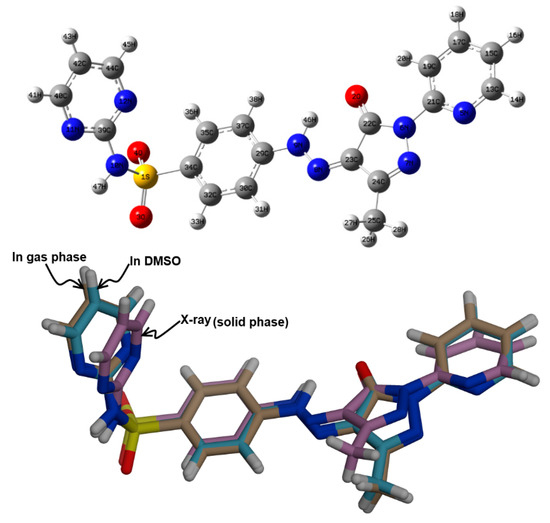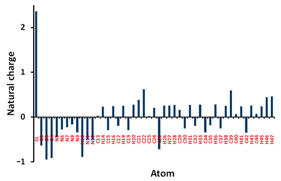 Natural charges of 5 shown in Figure 8 indicate that the O, N, and most of C-atoms are electronegative. The O-sites have charges ranging from −0.6363 to −0.9475 e where the most negative oxygen sites are those for the sulphonyl group. The corresponding S-atom is the most electropositive (2.3582 e). Regarding carbon atoms, C39 (0.5956 e) which is bonded to three nitrogen atoms and the carbonyl carbon (0.6173 e) is the most electropositive carbon site. In contrast, all the H-atoms are charged positively where the H46 (0.4409 e) and H47 (0.4617 e) are the most positive hydrogen sites. Presentation of electrostatic potential (MEP) is shown in Figure 9. The molecule has a net dipole moment of 4.9143 D.