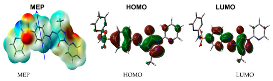 Among electronic parameters which play an important role are the HOMO and LUMO levels. These molecular orbitals are shown in Figure 9. It is clear that both are distributed over the π-system of the molecule. Hence, the HOMO→LUMO excitation is mainly a π–π* transition. Their energies are calculated to be −6.1158 and −2.7671 eV, respectively, and the HOMO–LUMO gap is 3.3487 eV. As a result, the reactivity indices [21,22,23,24,25,26,27] such as ionization potential (I), electron affinity (A), hardness (η), electrophilicity index (ω) and chemical potential (μ) are calculated to be 6.1158, 2.7671, 3.3487, 2.9455 and −4.4415 eV, respectively.