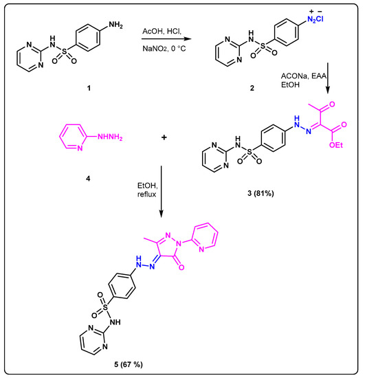 2.2. Synthesis of (E)-4-(2-(3-Methyl-5-oxo-1-(pyridin-2-yl)-1H-pyrazol-4(5H)-ylidene) hydrazinyl)-N-(pyrimidin-2-yl)benzenesulfonamide (5)