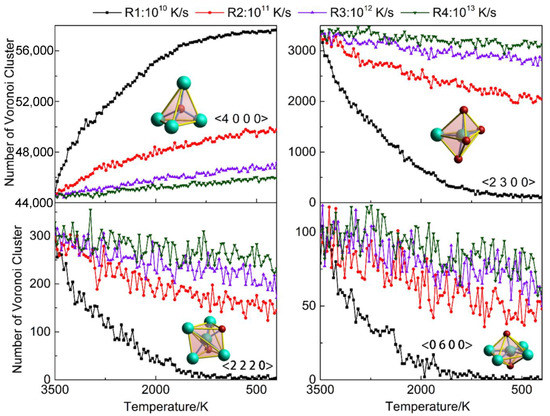 - Zhou, L.L.; Liu, R.S.; Hou, Z.Y.; Tian, Z.A.; Lin, Y.; Liu, Q.H. Simulation study of effects of cooling rate on evolution of micro-cluster structures during solidification of liquid Pb. Acta Phys. Sin. 2008, 57, 3653. [Google Scholar] [CrossRef]