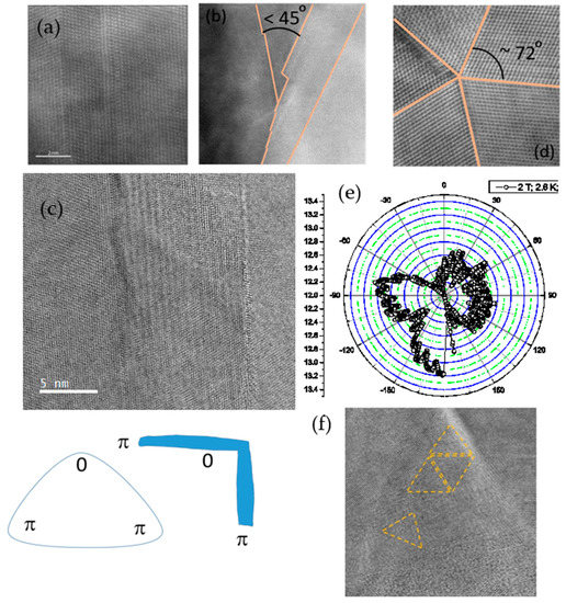 Now, we shall interpret the origin of RSOC in the diamond GB structure. The symmetry of a pair wavefunction is given by momentum × spin × frequency. A key parameter to describe the symmetry breaking of the grains producing the grain boundary region is defined as Σ = [C1⋅(C2 × C3)]/[a⋅(b × c)], which finds similarity with the symmetry breaking of the angular momentum vector in introducing the helicity popularly known as the Rashba SOI, described by Edelstein as interface SO: where c is one of the two nonequivalent normal unit vectors and the function describes the interface potential with a position vector (). We see such kinds of structures in Figure 2b. As seen in Figure 2c, the periodic potential variation in the GB from the mismatch of the lattice planes gives rise to modulation of Δ. To probe the complex symmetry of HBDDF films, detailed studies of angle (θ)-dependent resistance are conducted (see Figure 2e, this includes temperature-dependent resistance at different applied fields and isotherms of MR (followed by a Shockley model simulation)). The maxima of misalignment take place at the angle of 45° (or 72°), which gives the peak in the angle-dependent MR (Figure 2b,d,e). Such phenomena cannot occur in s-wave superconductors due to the isotropic pair potential and, thus, their observation has been used to classify superconducting systems [36]. The present observation of a superlattice-like sub-system (Figure 2c) has appeared to be different from the boron interfacial material claimed by previous authors; however, it shows other geometrical phases such as a triangle (Figure 2f). Such microstructures have been reported earlier (see Appendix A). These microstructures introduce a π-phase to the propagating Cooper pairs.