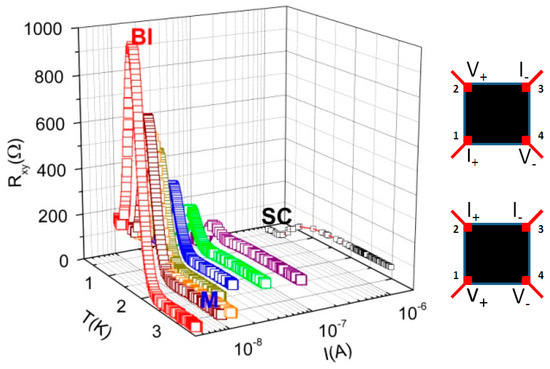Evolution of metal-insulator-superconductor (SC) transition with a current variation. from 1 μA down to 10 nA. The resistance shows various phases as current and temperature are varied. It is seen that as the bias current is reduced the bosonic insulator (BI) peak increases sharply but does not shift in position. The geometry for the transport property measurements is shown on the right.
