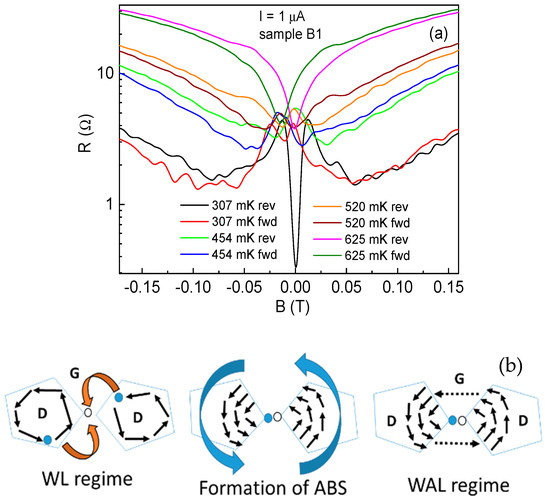 The MR of the sample is measured at different temperatures between 300 mK and 600 mK (Figure 4a) with the field applied normal to the film. We observe hysteresis at all temperatures. Qualitatively, this means the resistance increases sharply with the increasing field up to a maximum (sharp peak) and then decreases again as the field is further increased until it reaches the background curve. The hysteresis behavior has been observed in the R vs. B at different temperatures below or around the Tc, which is a new observation in these structures where magnetic impurities have not been introduced, therefore explaining the effect of RSOC in this system. The anomalous peak MRs of two kinds were observed, for example, one with a smooth transition and the other with asymmetric resonant peaks in the transition region (asymmetric with respect to the scan direction) (Figure 4a). This can be attributed to setting the combination of bias current and temperature to some point of instability regarding switching between superconducting and insulating states. These features can be attributed to the properties of π-Josephson junctions. The ABS is known to exist in the ab-plane of layered superconductors and at superconductor–normal metal interfaces, which explains the π-junction as shown in Figure 4b.