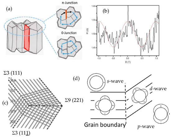 Magnetoresistance (a) A schematic indicating the geometry of conduction loops considered using the fitting model, which takes into account interference between 0−junction (of high transmission) and π−junctions (where phase scattering/spin flipping occurs). (b) An oscillatory magnetoresistance (recorded at 2.2 K) shows a more pronounced π−junction character. (c) Transport features are explained through the anisotropy of the crystal structures. The high proportion of ∑3 boundaries allows for higher-order twinning such as the ∑9 and this is schematically shown in (d) [21]. (d) The pairing symmetry s, d, and p−wave are shown as a shift of the charge distribution. (d−wave) Cooper pairs transmit through the grain boundaries.