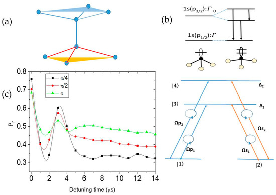 (a) Shockley model of topological phase [17]. Qubit arrangements show two connected triangles as closed loops and describe spin-orbit interactions. (b) The boron acceptor can be present in the GB, which removes the degeneracy of the 1s(p3/2) spin-orbit split level, hence creating a strong splitting of the energy levels [23]. A four-level energy (|1>–|4>) diagram of the spin triplets of a boron center showing the Rabi frequencies (Ωs,p) and the detuning is Δ1 = Δ2 = Δ [48]. (c) Shows the variation of Pr (or magnetoresistance) with detuning time (magnetic field) when spin-orbit is included. The qubits are also rotated in different angles from π/4 to π to show the intensity variation of the side peak, which is a signature of RSOC.