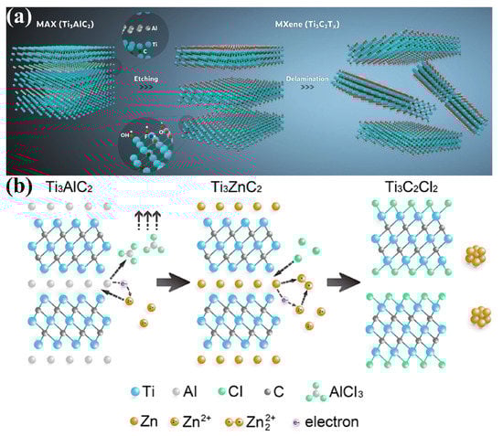 - Li, M.; Lu, J.; Luo, K.; Li, Y.; Chang, K.; Chen, K.; Zhou, J.; Rosen, J.; Hultman, L.; Eklund, P.; et al. Element Replacement Approach by Reaction with Lewis Acidic Molten Salts to Synthesize Nanolaminated MAX Phases and MXenes. J. Am. Chem. Soc. 2019, 141, 4730–4737. [Google Scholar] [CrossRef] [Green Version]