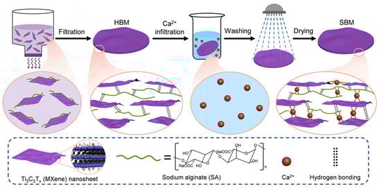 Schematic illustration of preparation of V-MXene film through sequential bridging of hydrogen and ionic bonding. Reproduced from [67], with the permission of National Academy of Science.