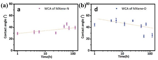Water contact angle of MXene-N (a) and MXene-O (b) over storing time. Reproduced from [80], with the permission of the Royal Society of Chemistry.