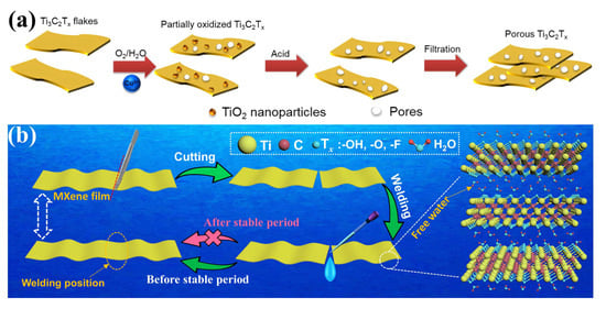 (a) Schematic illustration of preparation of porous MXene flakes by chemical etching. Reproduced from [83], with the permission of Wiley-VCH. (b) Schematic diagram of the welding process of MXene film. Reproduced from [84], with the permission of Elsevier.