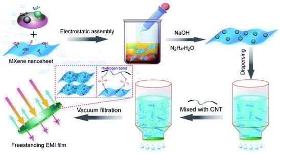 Schematic illustration of the preparation process of NiCo/MXene–CNT film. Reproduced from [99], with the permission of the Royal Society of Chemistry.