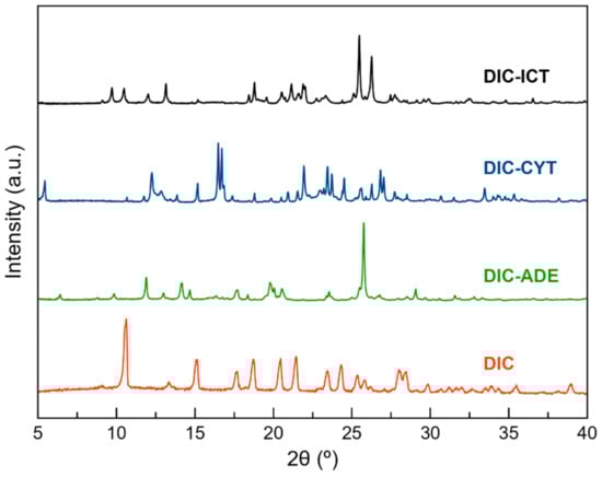 PXRD patterns of DIC, DIC–ADE, DIC–CYT, and DIC–ICT obtained by Liquid-Assisted Grinding (LAG) with methanol in a 1:1 ratio.