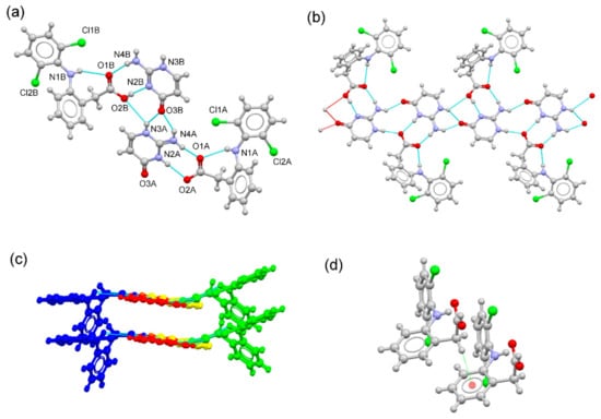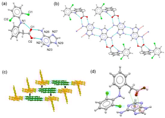 (a) Asymmetric unit of the DIC–ADE cocrystal. (b) Fragment of the tape structure generated by H-bonding interactions. (c) Detailed view of the crystal packing of the DIC–ADE cocrystal. Orange: DIC molecules, green: ADE molecules. (d) C=O···π and C-H···π interactions in the DIC–ADE cocrystal.