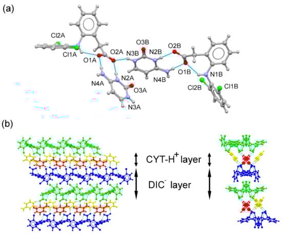 (a) Asymmetric unit of the DIC–CYT molecular salt. (b) Detailed view of the packing arrangement of DIC− anions (blue and green) and CYT–H+ cations (red and yellow) in the DIC–CYT crystal structure (viewed along the b and a axes), showing an alternating layered structure.