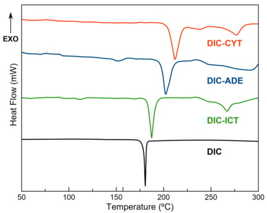 Differential scanning calorimetry (DSC) traces of DIC and multicomponent compounds DIC–ADE, DIC–CYT, and DIC–ICT.