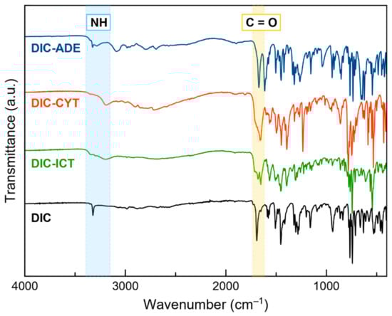 Fourier transform infrared (FT–IR) spectra of DIC, DIC–ADE, DIC–CYT, and DIC–ICT.