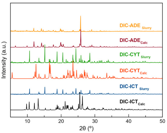 PXRD diagrams corresponding to the stability of DIC–ADE, DIC–CYT, and DIC–ICT in aqueous slurry experiments at 24 h.