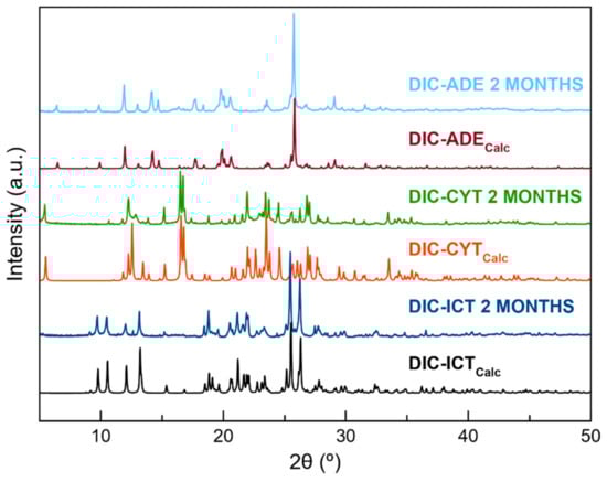 PXRD diagrams corresponding to the stability of DIC–ADE, DIC–CYT, and DIC–ICT in accelerated ageing conditions (40 °C, 75% RH) at two months.